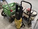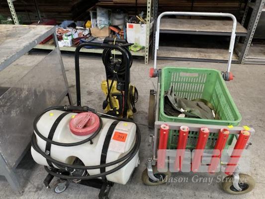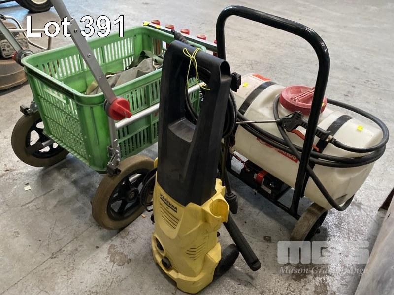 MOBILE SPRAY TANK UNIT, CROPLANDS, 12V WITH BATTERY PACK, 30 LITRE, PRESSURE CLEANER, KARCHER K2, 240V & FISHING TROLLEY WITH WADERS