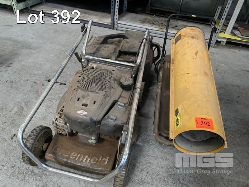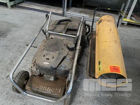 WORKSHOP HEATER, FAN FORCED, DIESEL, 240V & LAWNMOWER, GREENFIELD, B&S PETROL