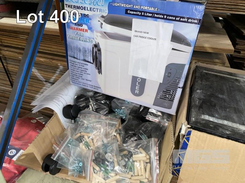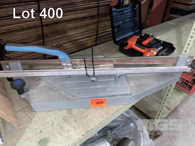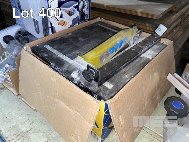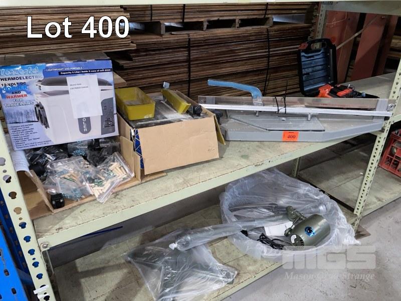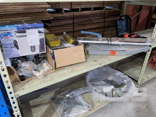 TILE CUTTER, 800mm, TILE SAW TABLE, TILE SOLUTIONS, 240V, WORKSHOP FANS, 700mm, 240V, (NEW), CAR FRIDGE COOLER, 12V & B&D CORDLESS DRILL, 2 x SHELVES