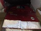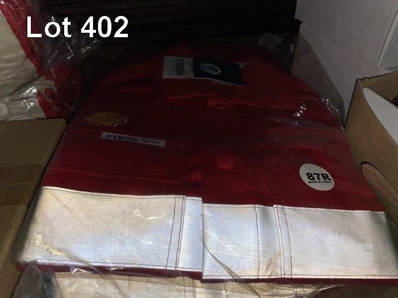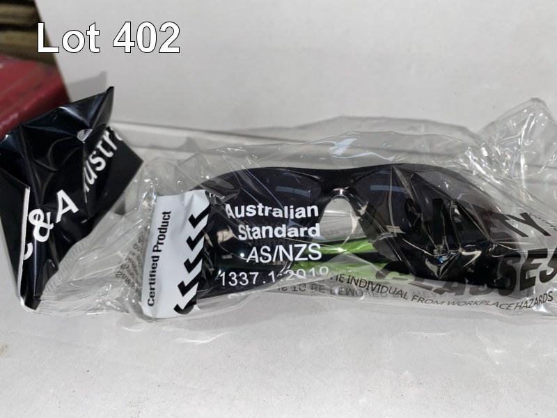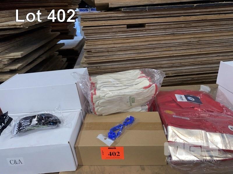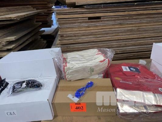 2 x PAIRS WORK OVERALLS, FTECH, RED WITH REFLECTIVE TAPE, SIZE: 87R 24 x PAIRS RIGGERS WORK GLOVES, MSA GRAND PRIX, SMALL, 1 x BOX WORK GLOVE BELT CLIPS & 3 x BOXES (12/BOX) SAFETY GLASSES, C&A AUSTRALIA, TINTED