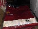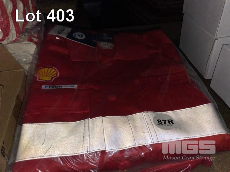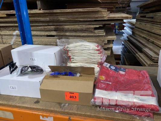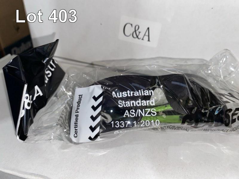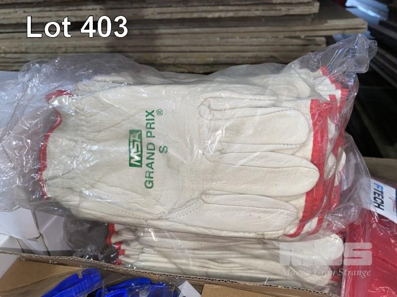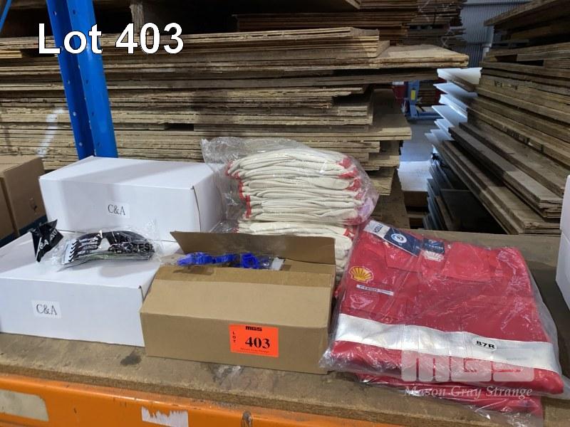 2 x PAIRS WORK OVERALLS, FTECH, RED WITH REFLECTIVE TAPE, SIZE: 87R 24 x PAIRS RIGGERS WORK GLOVES, MSA GRAND PRIX, SMALL, 1 x BOX WORK GLOVE BELT CLIPS & 3 x BOXES (12/BOX) SAFETY GLASSES, C&A AUSTRALIA, TINTED