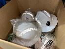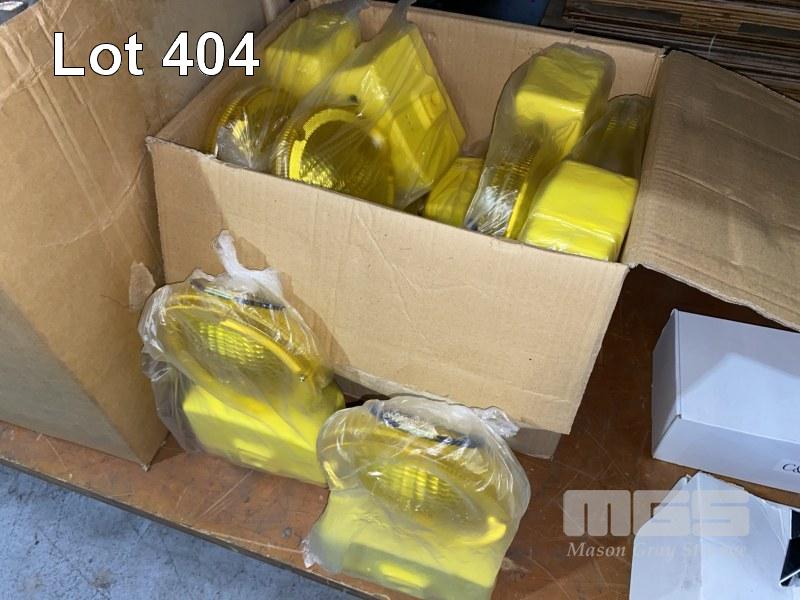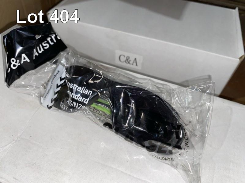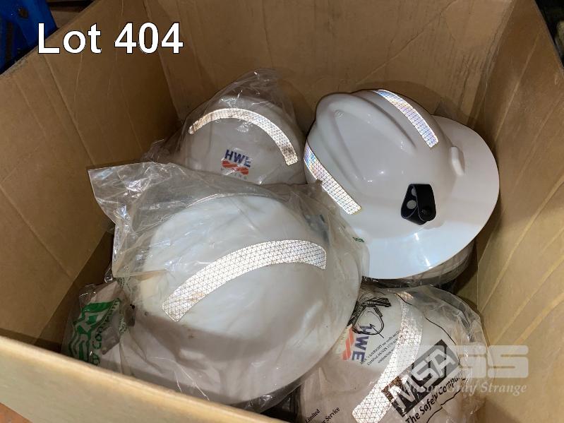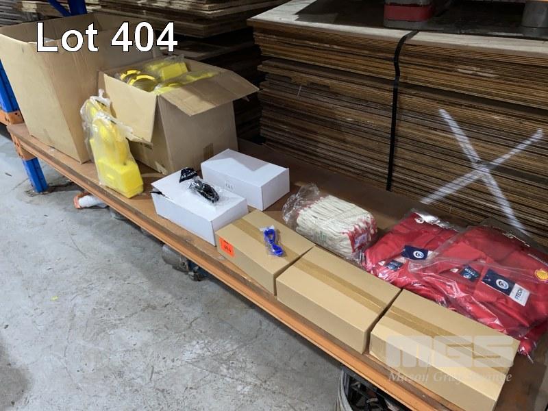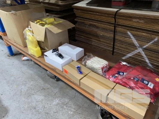 3 x PAIRS WORK OVERALLS, FTECH, RED WITH REFLECTIVE TAPE, SIZE: 87R 12 x PAIRS RIGGERS WORK GLOVES, MSA GRAND PRIX, SMALL, 3 x BOXES WORK GLOVE BELT CLIPS & 2 x BOXES (12/BOX) SAFETY GLASSES, C&A AUSTRALIA, TINTED & 1 x BOX FLASHING HAZARD LIGHTS & 1 X BOX OF WHITE HARD HATS