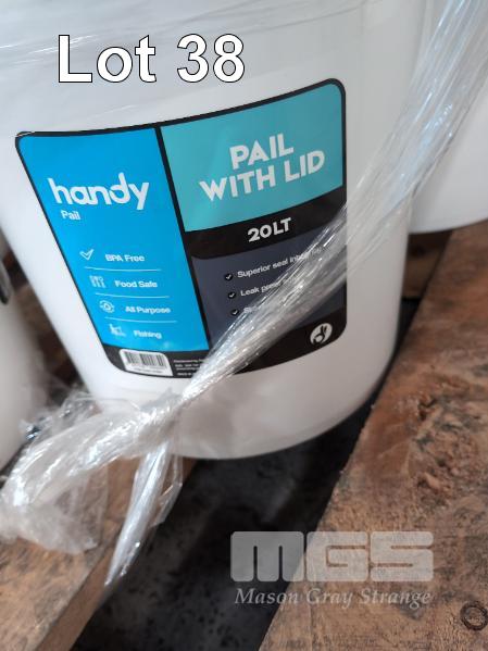 48 X NEW 20 LITRE WHITE FOOD SAFE PLASTIC PAILS WITH LIDS.