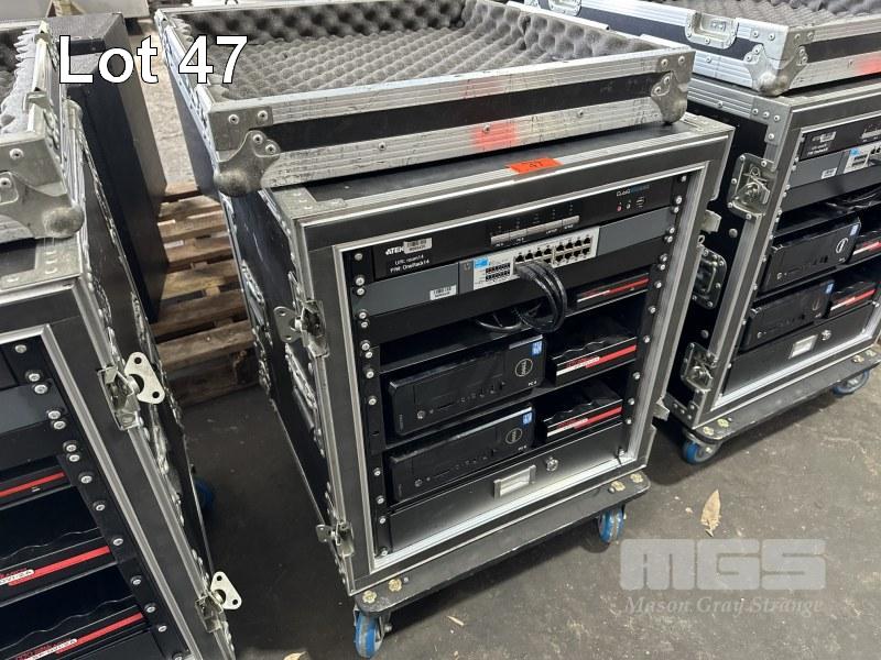MOBILE RACKMOUNT ROAD CASE, 65 x 60 x 67cm INC. - ATEN CUBIQ CS1644 KVM SWITCH - HP 1410-16G 16-PORT SWITCH, J9560A - HALL REASEARCH SP-HDMI-2A HDMI SPLITTER - EPIPHAN LECTURE RECORDER - AUSTRALIAN MONITOR AUDIO HUM ELIMINATOR - 2 x HALL RESEARCH SP-DVI-2A 2 PORT DVI SPLITTERS - 2 x DELL VOSTRO 270s, CORE i5 COMPUTERS