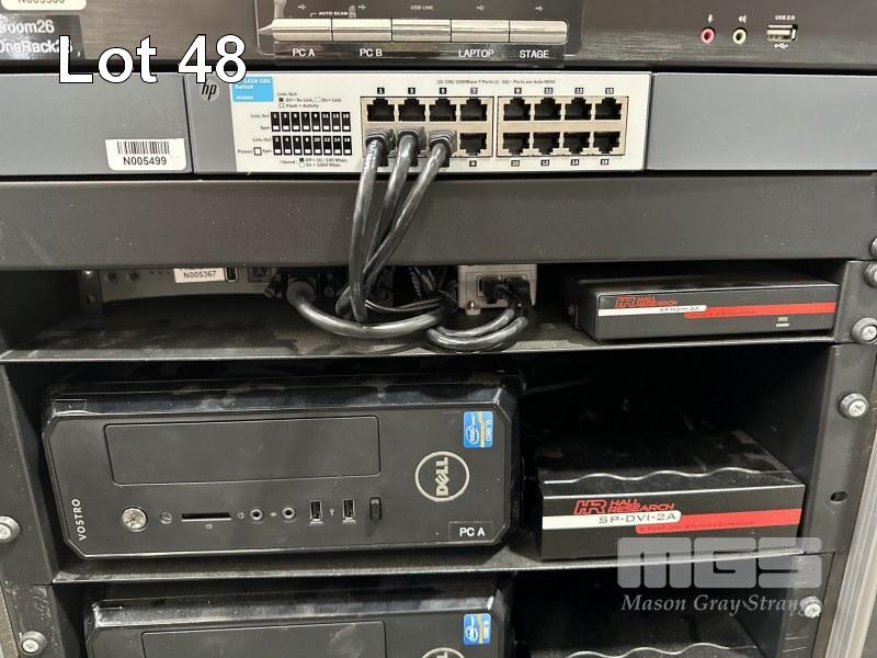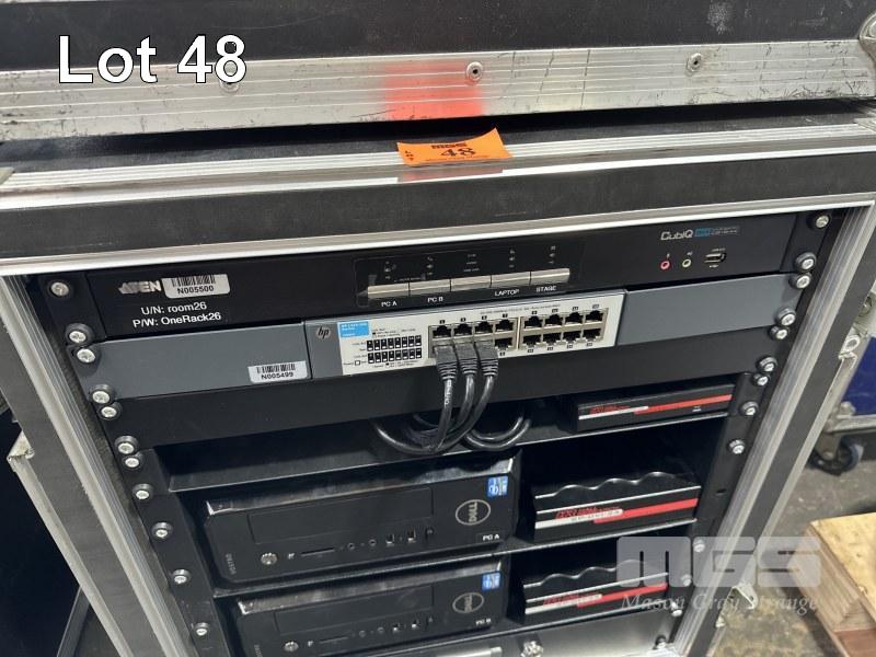 MOBILE RACKMOUNT ROAD CASE, 65 x 60 x 67cm INC. - ATEN CUBIQ CS1644 KVM SWITCH - HP 1410-16G 16-PORT SWITCH, J9560A - HALL REASEARCH SP-HDMI-2A HDMI SPLITTER - EPIPHAN LECTURE RECORDER - AUSTRALIAN MONITOR AUDIO HUM ELIMINATOR - 2 x HALL RESEARCH SP-DVI-2A 2 PORT DVI SPLITTERS - 2 x DELL VOSTRO 270s, CORE i5 COMPUTERS