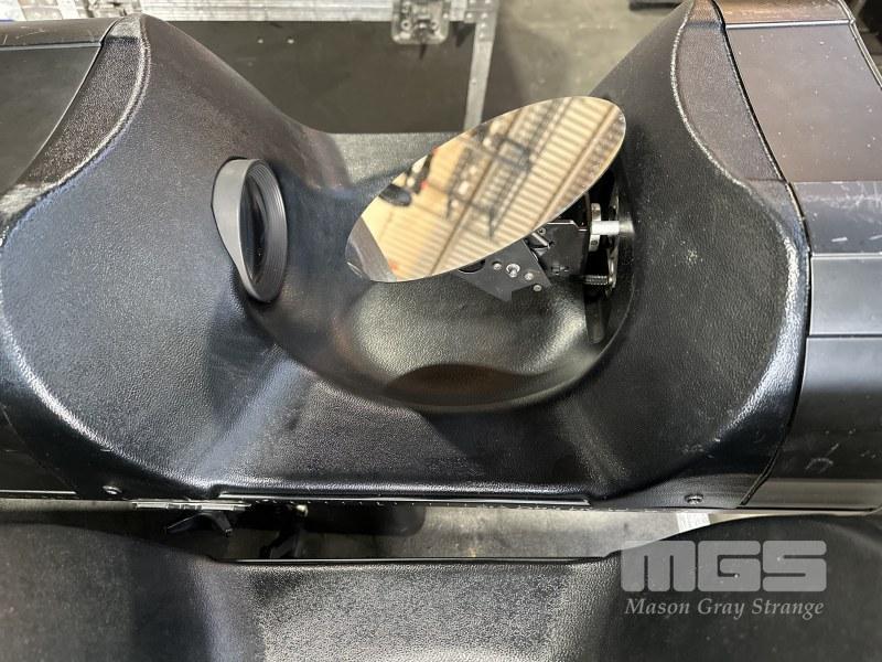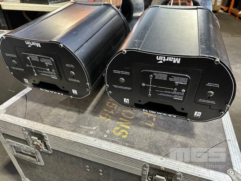 2 x MARTIN ROBOSCAN PRO 918 MOVING MIRROR LIGHTS WITH MOBILE ROAD CASE, 91 x 83 x 45cm