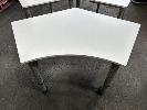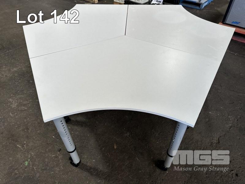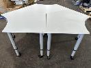 3 x MOBILE PENTAGON OFFICE TABLES, WHITE LAMAINTE TOP, HEIGHT ADJUSTABLE WITH LOCKABLE CASTORS EACH 80 x 80 x 64cm, ADJUSTABLE FROM 56cm TO 82cm HIGH