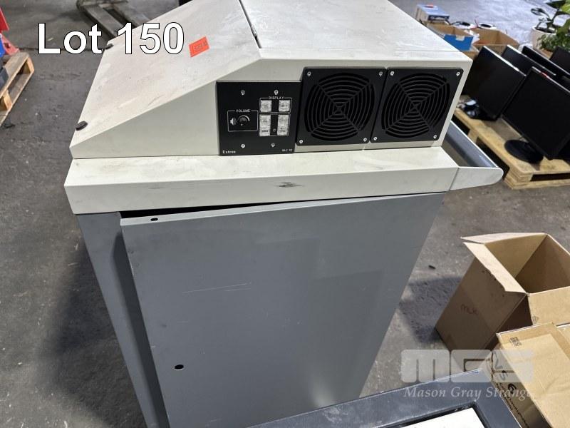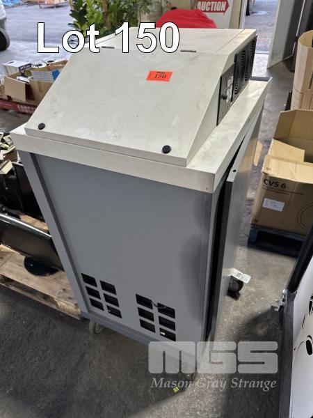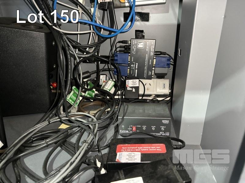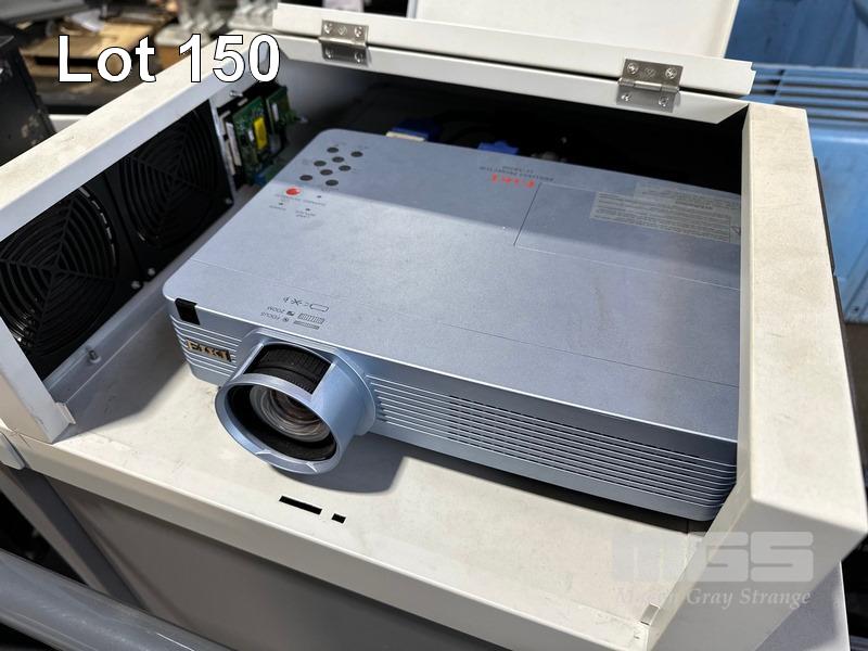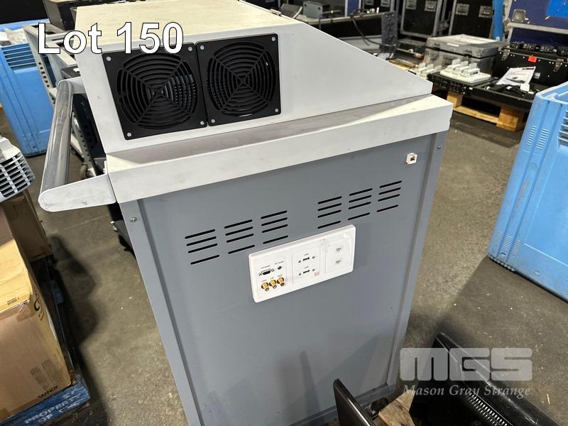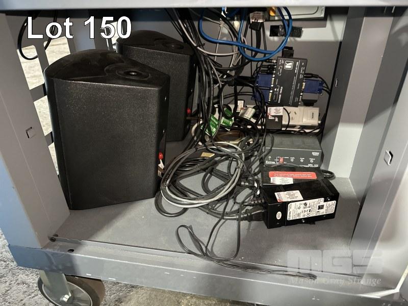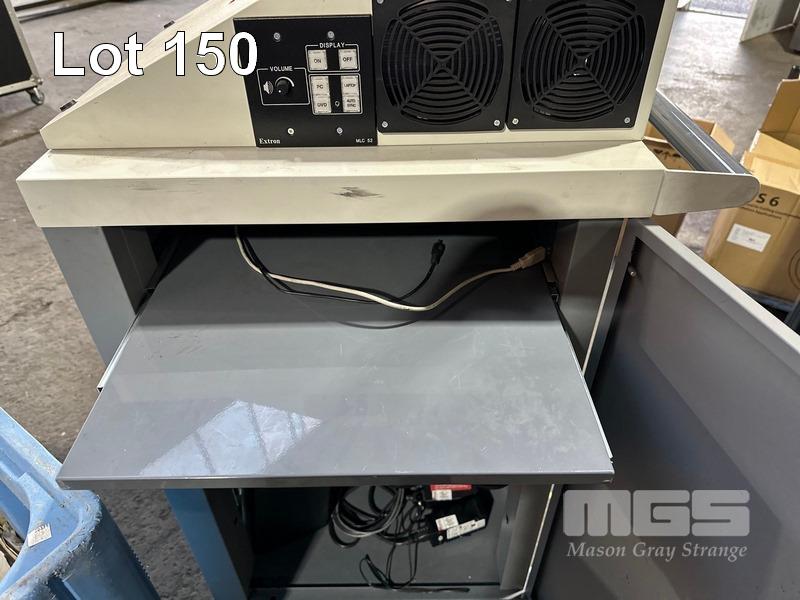 MOBILE CABINET WITH EIKI LC-XB200 DATA PROJECTOR, AUSTRALIAN MONITOR AM30WS SPEAKERS, KRAMER SWITCHER, EXTRON POWER AMPLIFIER, D-LINK SWITCH