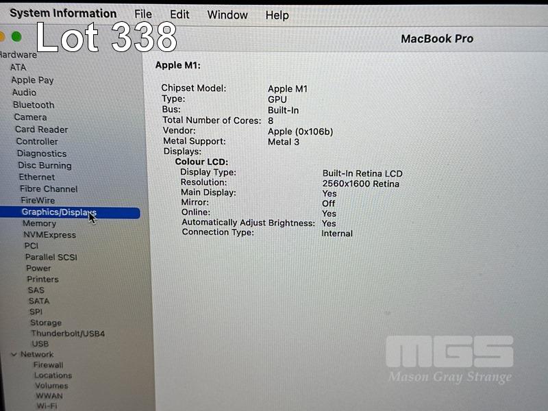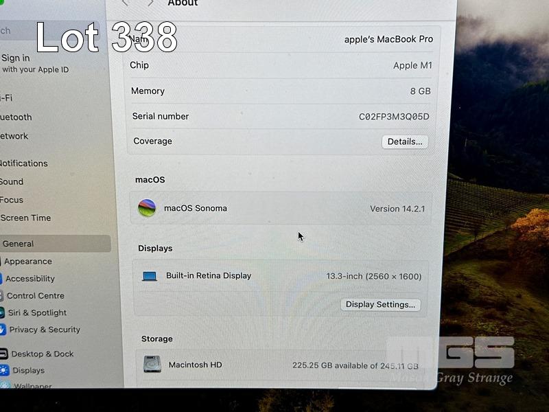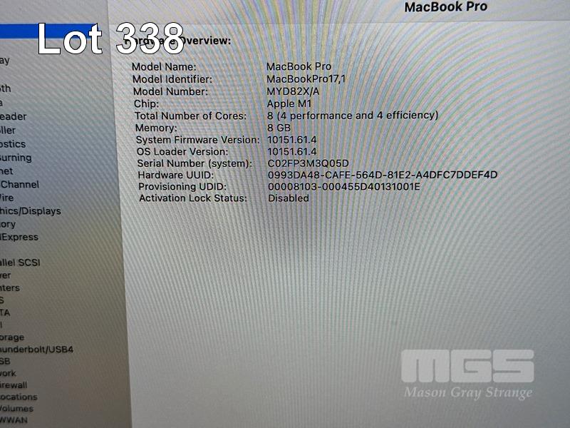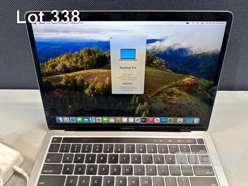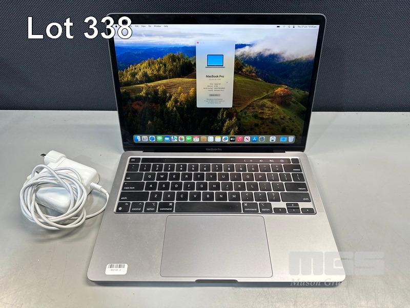 LAPTOP, APPLE MACBOOK PRO (A2338), MYD82X/A, APPLE M1 8 CPU/8 GPU, 8GB RAM, 256GB SSD, 13.3" RETINA DISPLAY (2560x1600), Wi-Fi, BLUETOOTH, MAC OS 14 INSTALLED & USB-C POWER SUPPLY (NOTE: MINOR MARKS ON SCREEN) S/N:C02FP3M3Q05D