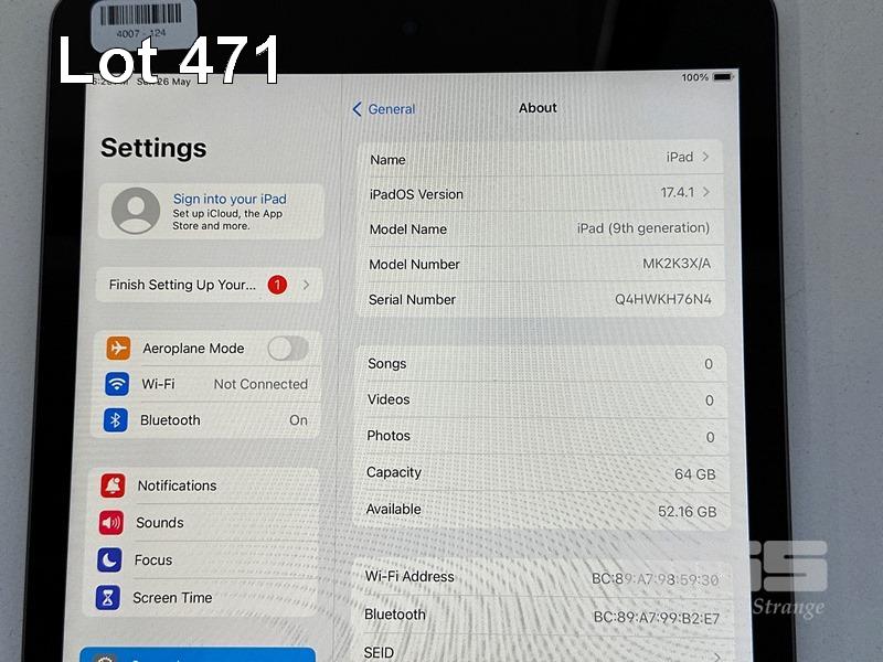 APPLE iPAD 9TH GEN, 64GB, Wi-Fi, SPACE GREY, MODEL MK2K3X/A, A2602 (NO CABLE, NO CHARGER) S/N:Q4HWKH76N4