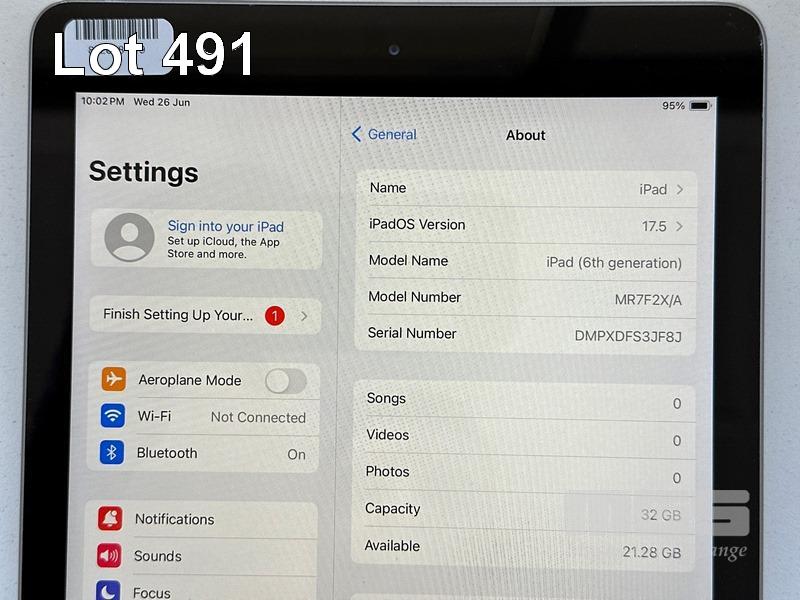 APPLE iPAD 6TH GEN, 32GB, Wi-Fi, SPACE GREY, MODEL MR7F2X/A, A1893 (NO CABLE, NO CHARGER) S/N:DMPXDFS3JF8J