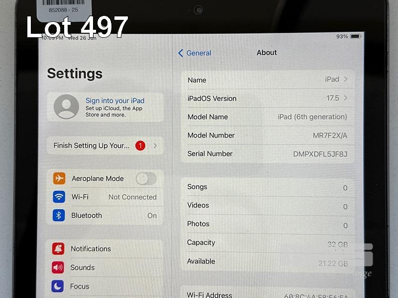 APPLE iPAD 6TH GEN, 32GB, Wi-Fi, SPACE GREY, MODEL MR7F2X/A, A1893 (NO CABLE, NO CHARGER) S/N:DMPXDFL5JF8J