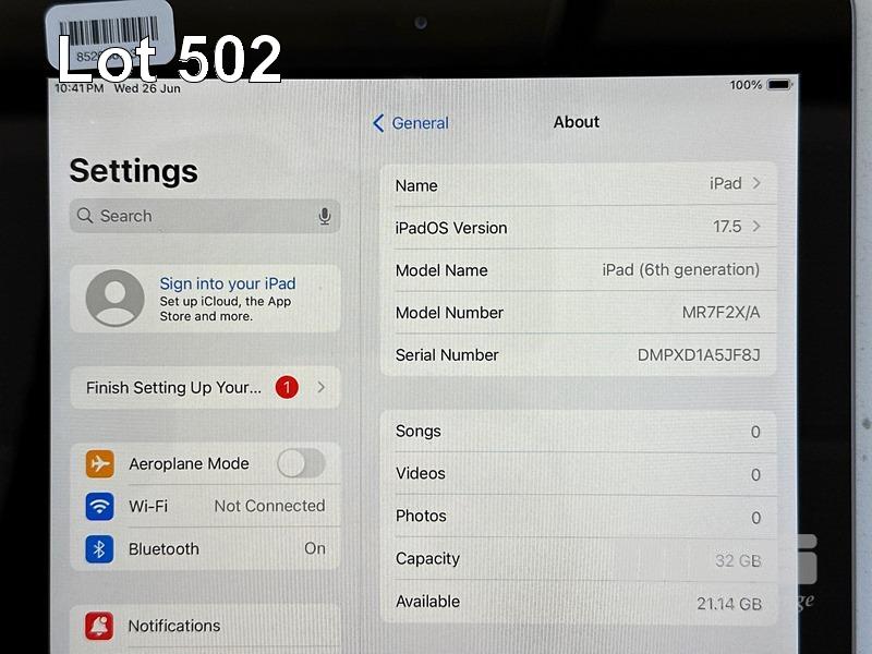 APPLE iPAD 6TH GEN, 32GB, Wi-Fi, SPACE GREY, MODEL MR7F2X/A, A1893 (NO CABLE, NO CHARGER) S/N:DMPXD1A5JF8J
