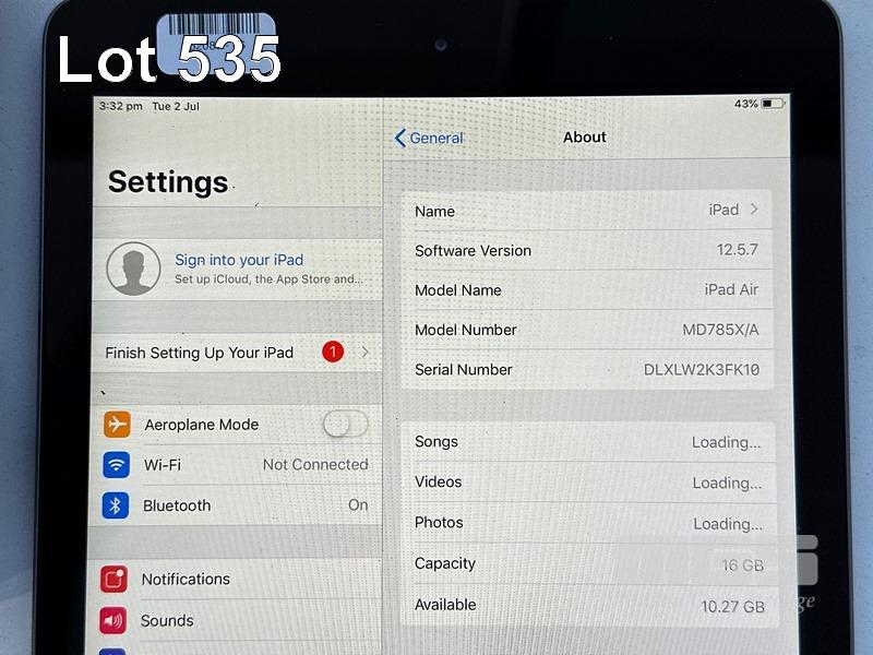 APPLE iPAD AIR, 16GB, Wi-Fi, SPACE GREY, MD785X/A, MODEL A1474 WITH CABLE, CHARGER & CARRY CASE S/N:DLXLW2K3FK10