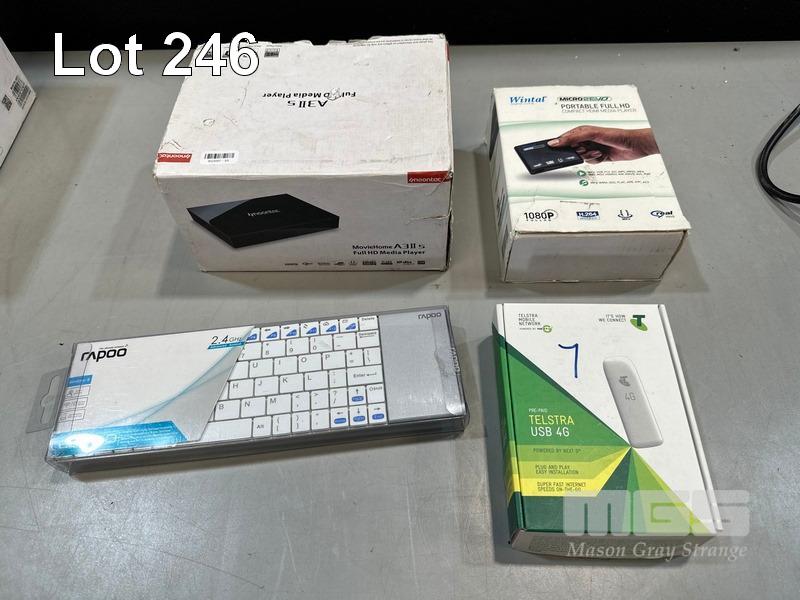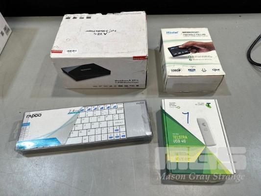 NOONTEC A3IIS FULL HD MEDIA PLAYER, WINTAL PORTABLE COMPACT HDMI MEDIA PLAYER, RAPOO E2700 WIRELESS TOUCHPAD KEYBOARD, TELSTRA USB 4G MODEM