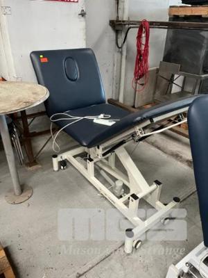 CONFYCARE TREATMENT TABLE, ADJUSTABLE HEIGHT, INCLINE & LEG REST, 240V 10 AMP PLUG BLUE VINYL, MOBILE CASTOR WHEELS, FOOT OPERATED CONTROLS