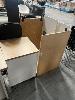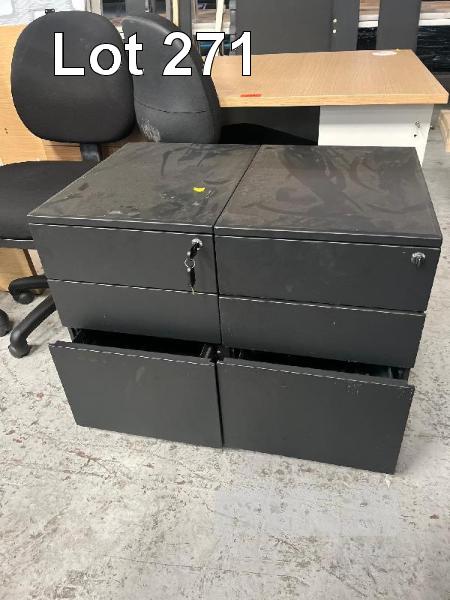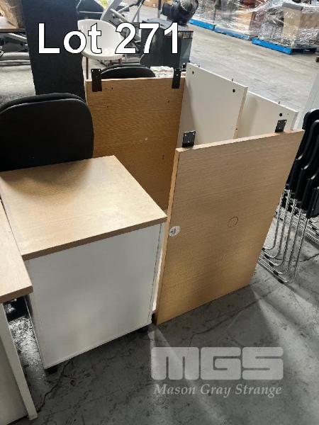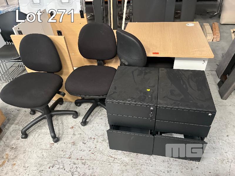 L-SHAPE DESK, BEECH LAMINATE (DISMANTLED), 2 x MOBILES & 3 x BLACK FABRIC OFFICE CHAIRS