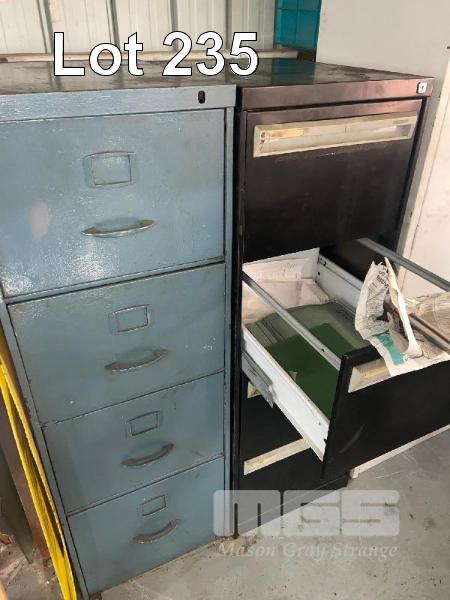 STEEL STOCK CUPBOARD, 2 DOOR, 2 x STEEL 4 DRAWER FILING CABINETS, 2 x WORK DESKS & 2 x CHAIRS