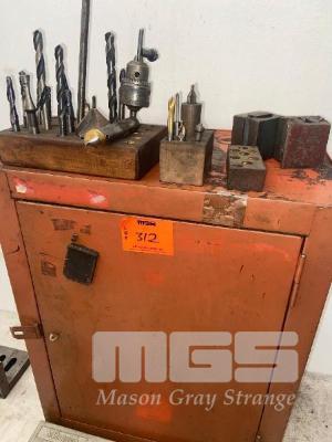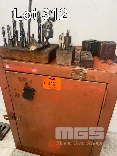 SMALL WALL MOUNT TOOL CABINET & CONTENTS, VEE BLOCKS, DRILLS, DRILL CHUCK,MILL CUTTERS & END MILLS