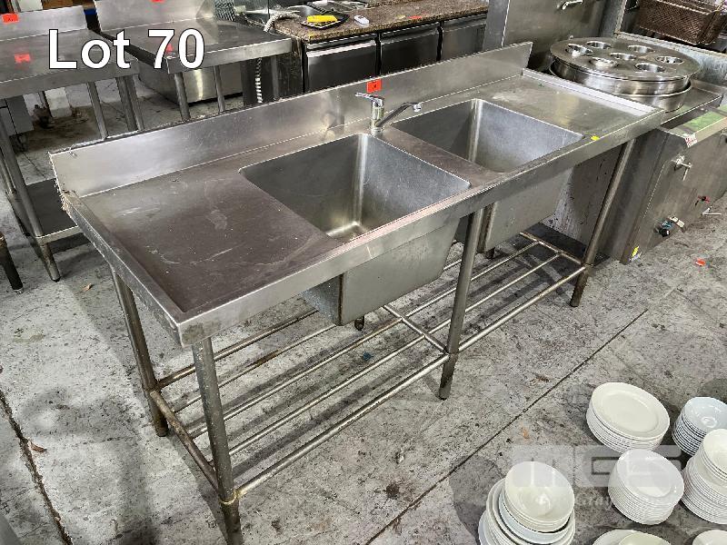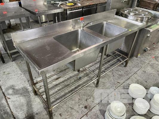 STAINLESS STEEL TWIN BOWL SINK, 1800 x 600mm WITH SPLASHBACK & MIXER TAP