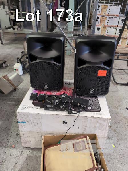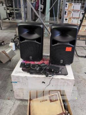 YAMAHA STAGEPASS 600BT PORTABLE BLUETOOTH PA SYSTEM. REALISTIC FM WIRELESS MICROPHONE SYSTEM, 4 X SPEAKER STANDS ETC.