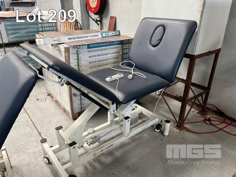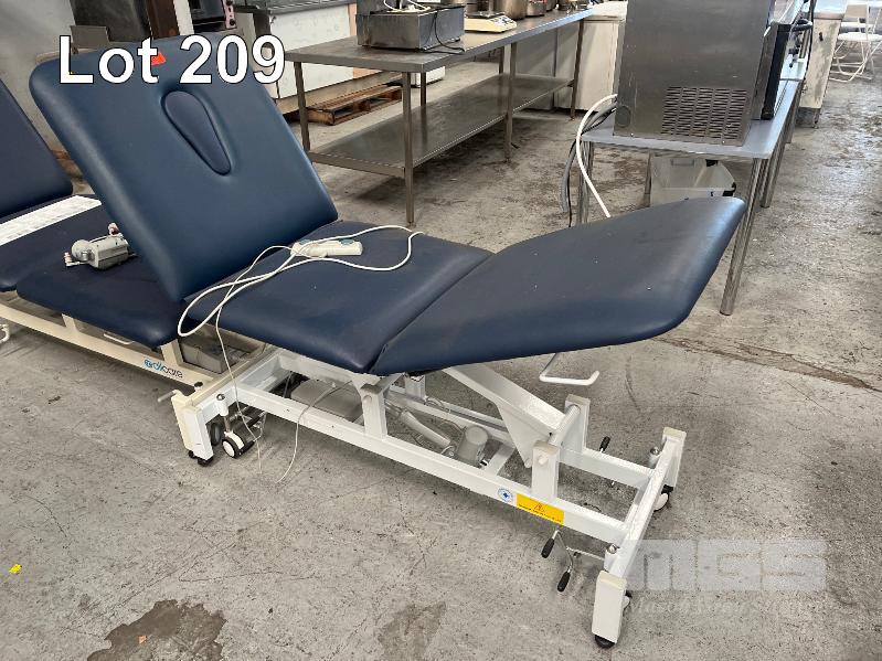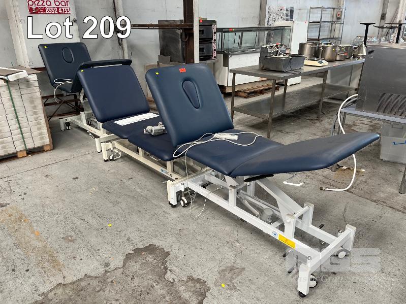 2 x ALL CARE TREATMENT TABLES, ADJUSTABLE HEIGHT, INCLINE & LEG REST, 240V 10 AMP PLUG BLUE VINYL, MOBILE CASTOR WHEELS, FOOT OPERATED CONTROLS & CONFYCARE TREATMENT TABLE, ADJUSTABLE HEIGHT, INCLINE & LEG REST, 240V 10 AMP PLUG BLUE VINYL, MOBILE CASTOR WHEELS, FOOT OPERATED CONTROLS