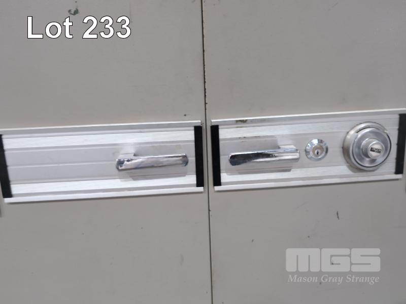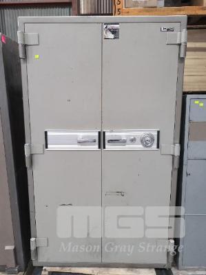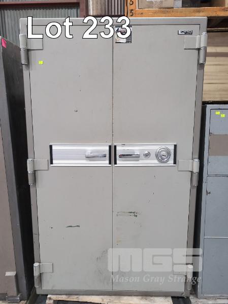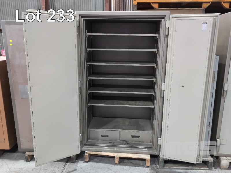 LORD 2-DOOR FIRE RESISTANT DOCUMENT SAFE. KEY AND COMBINATION LOCKS, 1 X KEY. 7 X SHELVES AND 2 X LOCKABLE DRAWERS WITH KEY. 1040 X 700 X 1740 MM (W D H). WEIGHT 900 KG. 1 HOUR FIRE RATING.