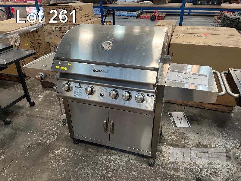 GRANDHALL PREMIUM 4S MOBILE STAINLESS STEEL COVERED GAS BBQ ON CABINET TROLLEY. FEATURES STAINLESS STEEL HOOD, 2-DOOR STAINLESS STEEL CABINET TROLLEY WITH 4-BURNERS PLUS BACK-BURNER, SIDEBURNER AND ELECTRONIC IGNITION. MODEL 1001SPP NEW IN BOX (2 X BOXES). ORP $1,599