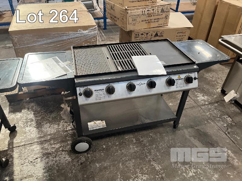 GRILLMASTER MOBILE FLAT TOP GAS BBQ 6-BURNER WITH TROLLEY.