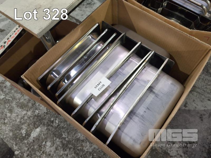 COLLECTION ASSORTED STEAM TRAYS, LIDS & CHAFFING PANS, STANDS & CANDLES (1 X TABLE & 3 X BOXES)