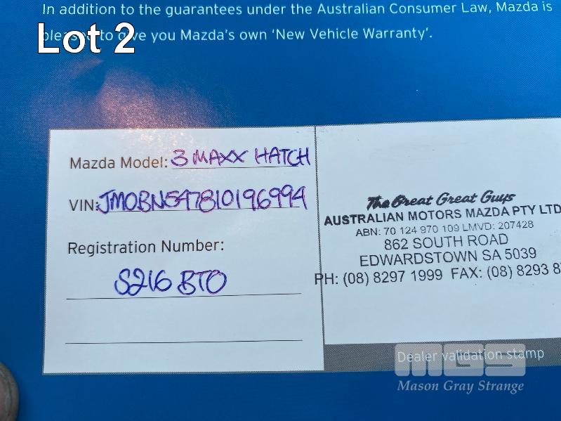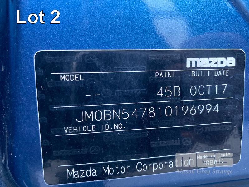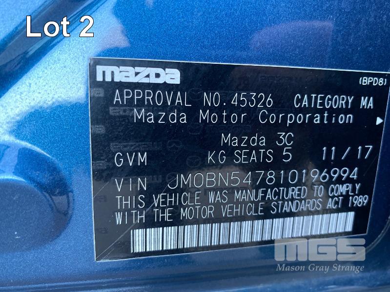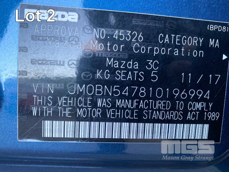 2017 MAZDA 3C MAXX HATCHBACK REG: S216 BTO (SA) (EXPIRED) VIN: JM0BN547810196994 ENG: PE21029547 ODO: 96,571kms SHOWING SKYACTIV-G, 2.O LTR, EFI, SPORTS AUTOMATIC TRANSMISSION, ETERNAL BLUE (45B), 4 DOORS, 5 SEAT, ABS, AIR BAG, AIR CON, ALLOY WHEELS, BLUETOOTH, CENTRAL LOCKING, CRUISE CONTROL, DECALS, IMMOBILISER, POWER STEERING, POWER WINDOWS, SPARE WHEEL, TRACTION CONTROL, I-STOP, REVERSING CAMERA KEY #8 (WITH 2 KEY/S, WITH OWNER'S MANUAL, WITH SERVICE BOOKS) CONDITION: BODY - MINOR DENTS & SCRATCHES