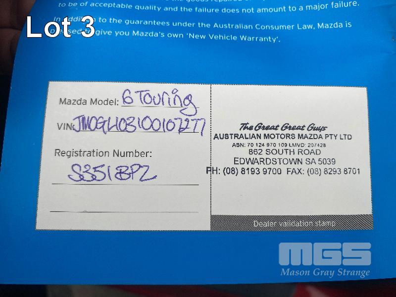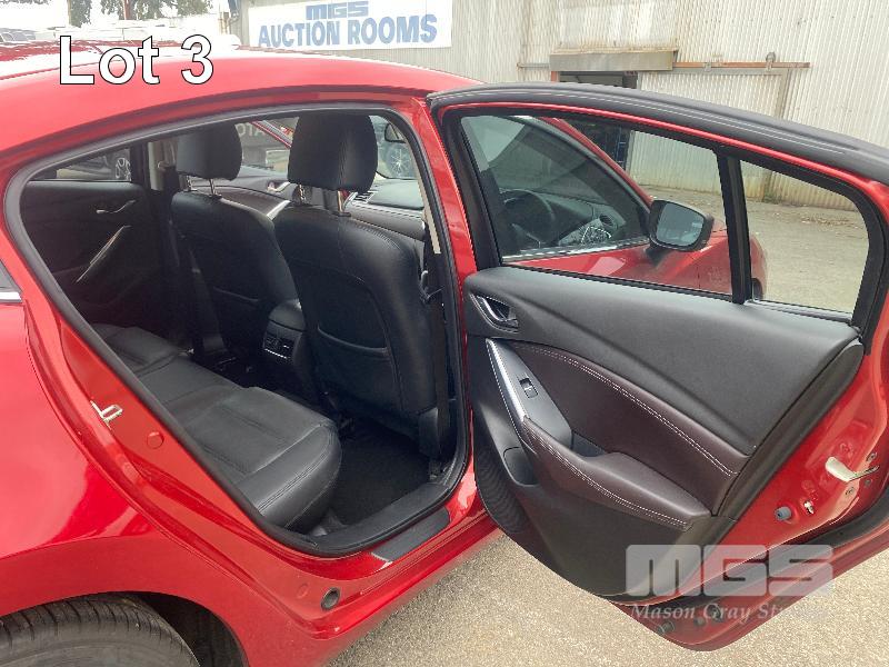 2016 MAZDA 6C TOURING SEDAN REG: S354 CZE (SA) VIN: JM0GL103100107277 ENG: PY20860889 ODO: 115,868kms SHOWING SKYACTIVE 2.5 LITRE EFI, SPORTS AUTOMATIC TRANSMISSION, RED DUCO, 4 DOORS, 5 SEAT, ABS, AIR BAG, AIR CON, ALLOY WHEELS, BLUETOOTH, CENTRAL LOCKING, CRUISE CONTROL, IMMOBILISER, LEATHER TRIM, POWER STEERING, POWER WINDOWS, SAT NAV, SPARE WHEEL, TOW BAR, TRACTION CONTROL, REVERSE CAMERA KEY # 20 (WITH PAPERS, WITH 2 KEY/S, WITH OWNER'S MANUAL, WITH SERVICE BOOKS)
