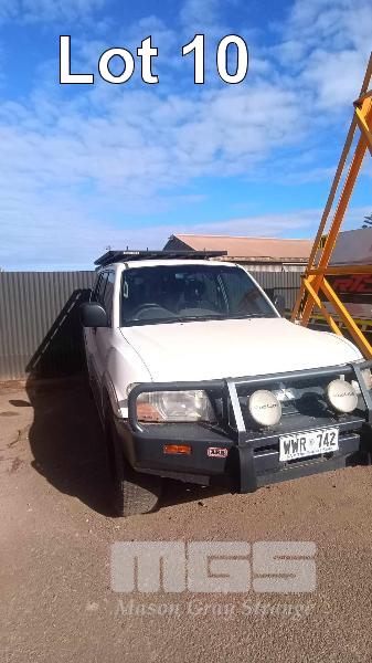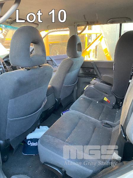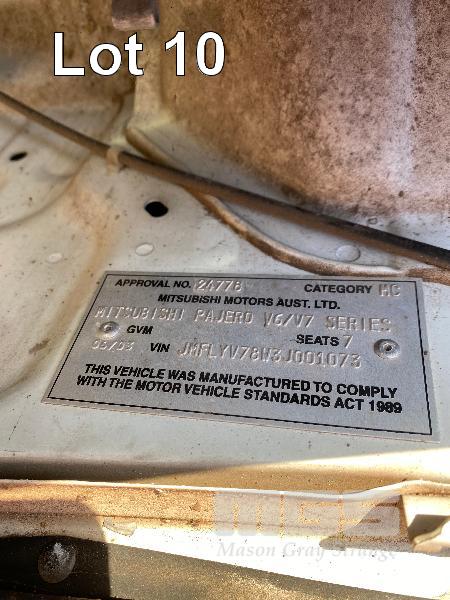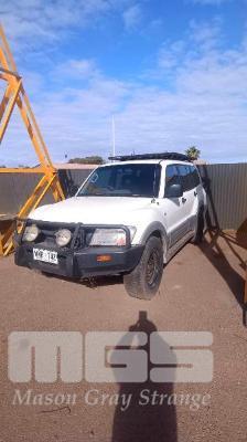 2003 MITSUBISHI PAJERO V6/V7 SERIES GLS STATION WAGON 4x4 REG: NO PLATES (SA) VIN: JMFLYV78W3J001073 ENG: 4M41GD6892 ODO: 305,551kms SHOWING 4 CYLINDER TURBO DIESEL, AUTOMATIC TRANSMISSION, WHITE DUCO, 4 DOORS, 7 SEAT, 4x4 AIR CON, ALLOY WHEELS, BULL BAR, CARGO BARRIER, CD PLAYER, SIDE STEP, SPOT LIGHTS, ROOF CARRY ALL 2 WAY RADIO (SOLD IN SITU LOCATED IN WHYALLA, INSPECT BY APPOINTMENT) ***WILL BE SOLD WITH NO REGISTRATION PLATES*** (WITH 1 KEY/S, WITH OWNER'S MANUAL) CONDITION: ENGINE - FUEL PUMP HAS FAILED - ENGINE CRANKS BUT DOES NOT START