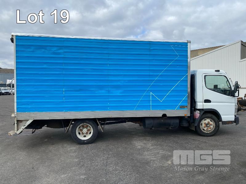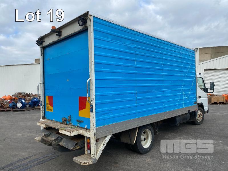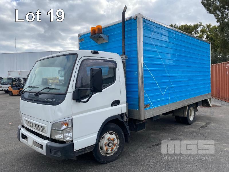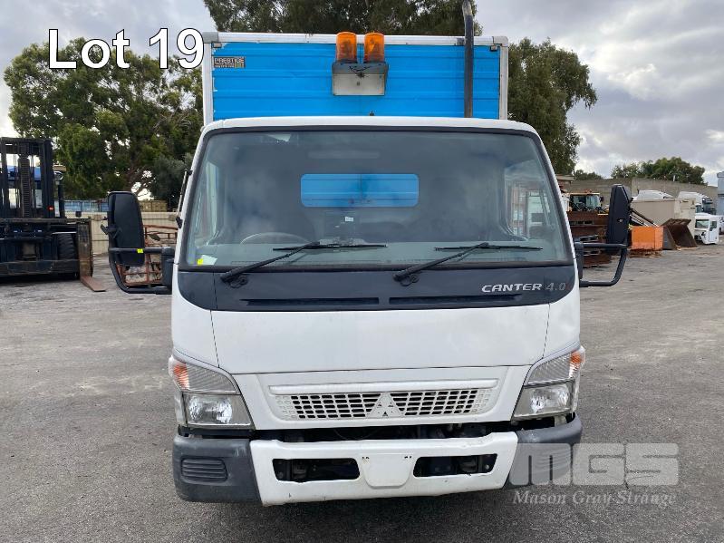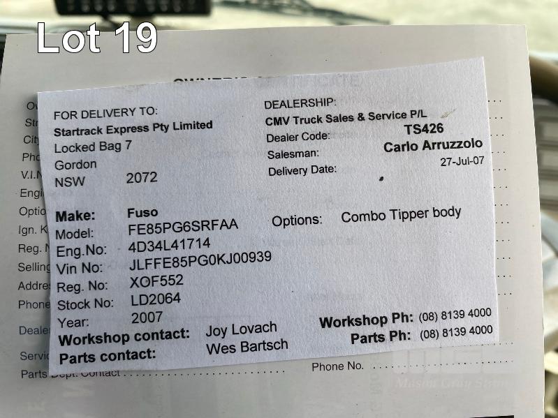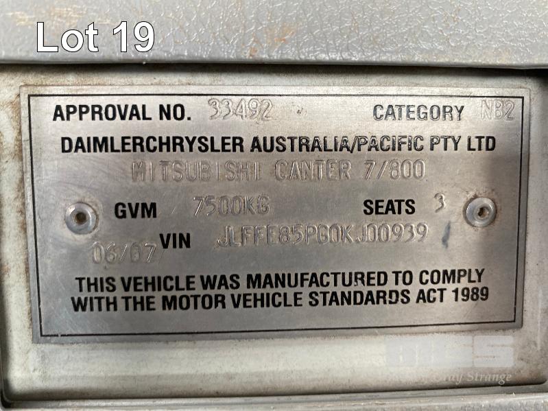 2007 MITSUBISHI CANTER 7/800 FE85PG6 4x2 SINGLE CAB PANTEC REG: NO PLATES VIN: JLFFF85PG0KJ00939 ENG: 4D34L41714 ODO: 251,504kms SHOWING GVM: 7,500kg GCM: 11,000kg MITSUBISHI, 4 CYLINDER TURBO DIESEL, 5 SPEED MANUAL TRANSMISSION, SPRING SUSPENSION, WHITE/BLUE, 215/75R17.5, 2 DOORS, 3 SEAT, AIR CON, REAR HYDRAULIC TAILGATE LOADER, (NO REMOTE CONTROL) PANTEC FITTED OUT WITH SHELVING REAR ROLLER DOOR REVERSE CAMERA WITH LCD SCREEN SPARE WHEEL BODY SIZE: 4850 x 2300 x 2150mm (H) KEY #40 (WITH PAPERS, WITH 1 KEY/S, WITH OWNER'S MANUAL)