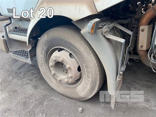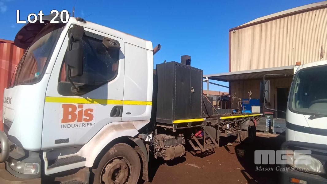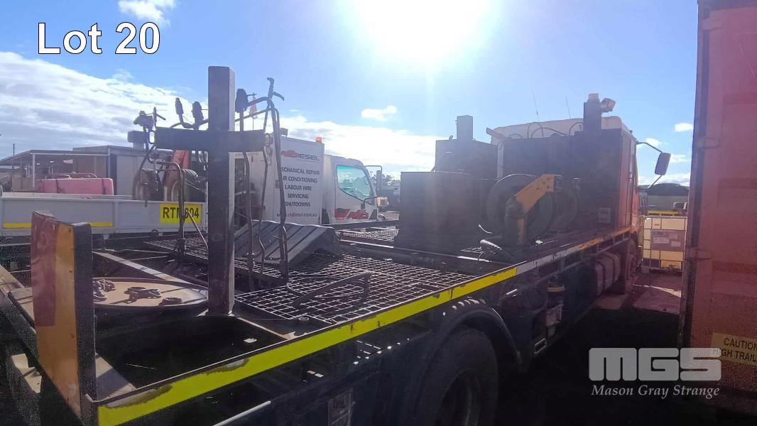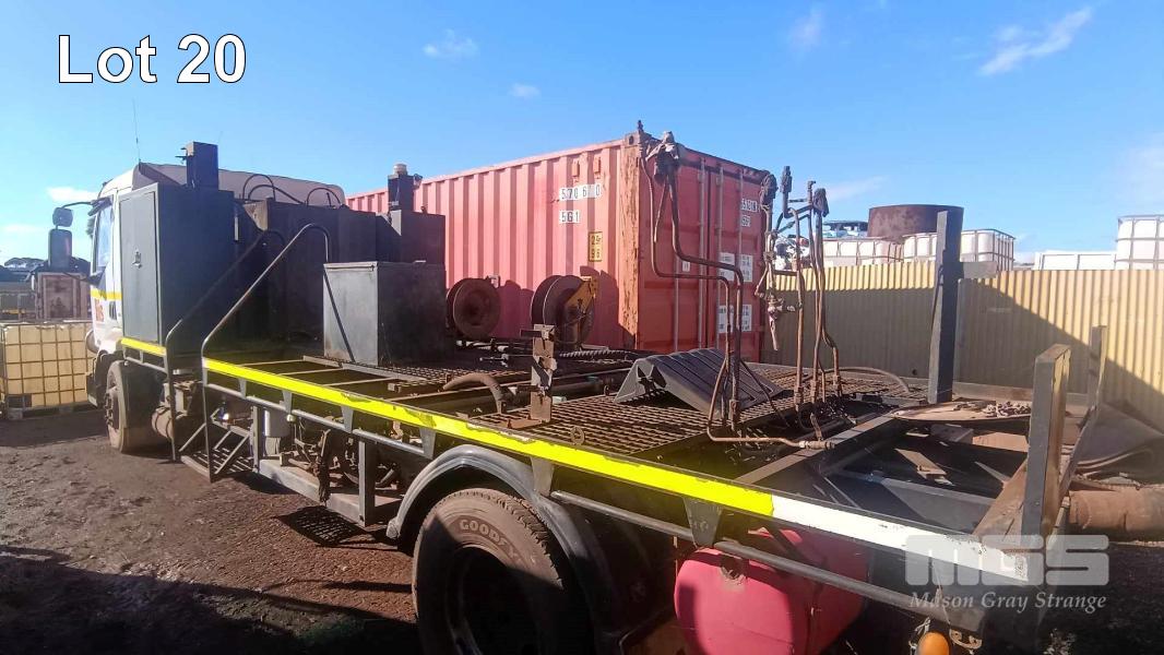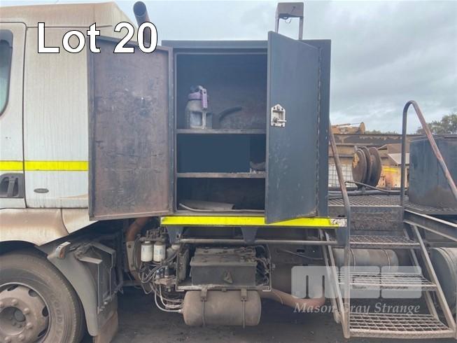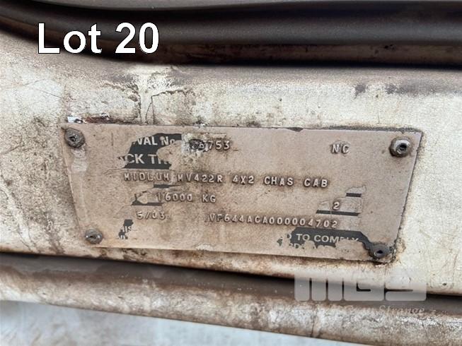 2003 MACK MV422R 4x2 CAB OVER TRAY TOP TRUCK REG: NO PLATES VIN: VF644ACA000004702 ENG: 83M0548680 ODO: N/A GVM: 16,000kg GCM: 19,500kg RENAULT, DCI 6 ACJOI, 6 CYLINDER TURBO DIESEL, 8 SPEED MANUAL TRANSMISSION, AIRBAG SUSPENSION, WHITE DUCO, 305/70R19.5, 2 DOORS, AIR CON, BULL BAR, STEEL TRAY, PTO, FITTED WITH RETRACTABLE HOSE REELS, STORAGE BOXES, UNDER TRAY WATER TANK TRAY SIZE: 6245 (L) x 2470 mm (W) OIL/FUEL TANKS MOUNTED BEHIND CAB (SOLD IN SITU, LOCATED IN WHYALLA, INSPECT BY APPOINTMENT) (WITH 1 KEY/S)