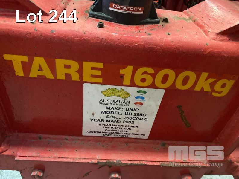 2002 MINI SPIDER CRAWLER CRANE, UNIC MOD: UR295C MRC 2,500kg S/NO: 250C0400 POWERED BY ROBIN PETROL ENGINE MOD: EV28 HOURS: 1,047 SHOWING RUBBER TRACKED 5 STAGE TELESCOPIC BOOM LAST 10 YEAR INSPECTION DATE: 22/7/2013 LAST ANNUAL INSPECTION: 19/11/19 4 x HYDRAULIC OUTRIGGERS TARE: 1,600kg (2019 ANUAL INSPECTION REPORT IN OFFICE) KEY #58