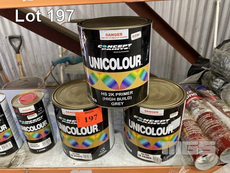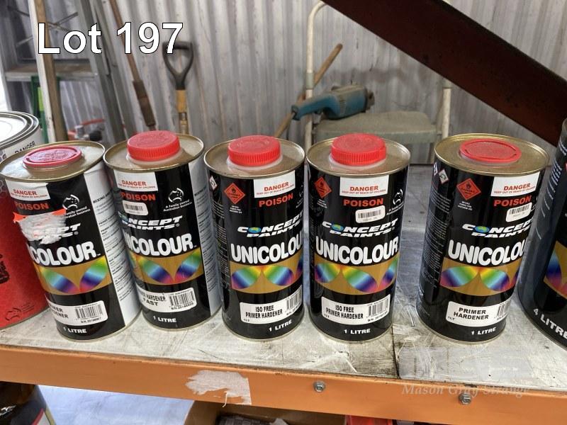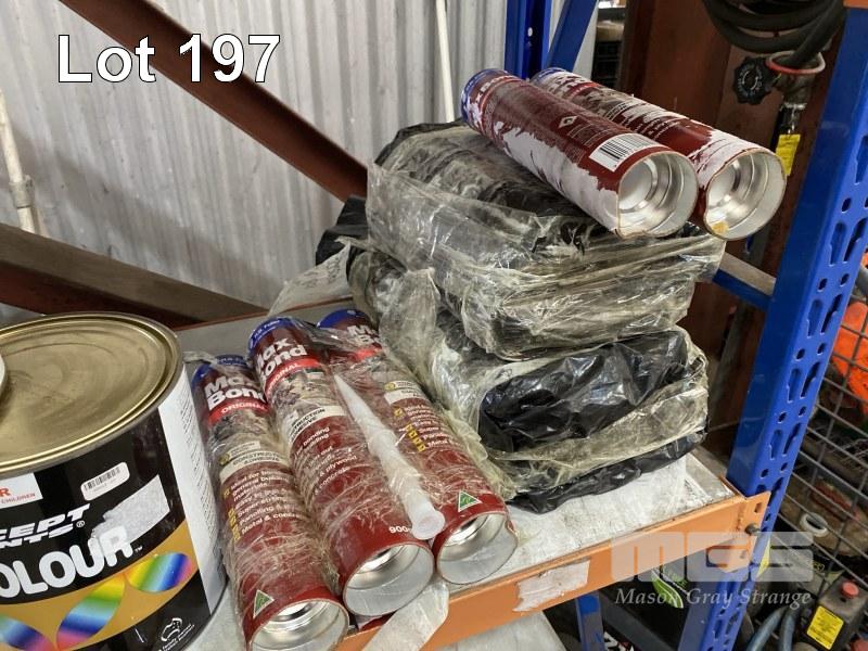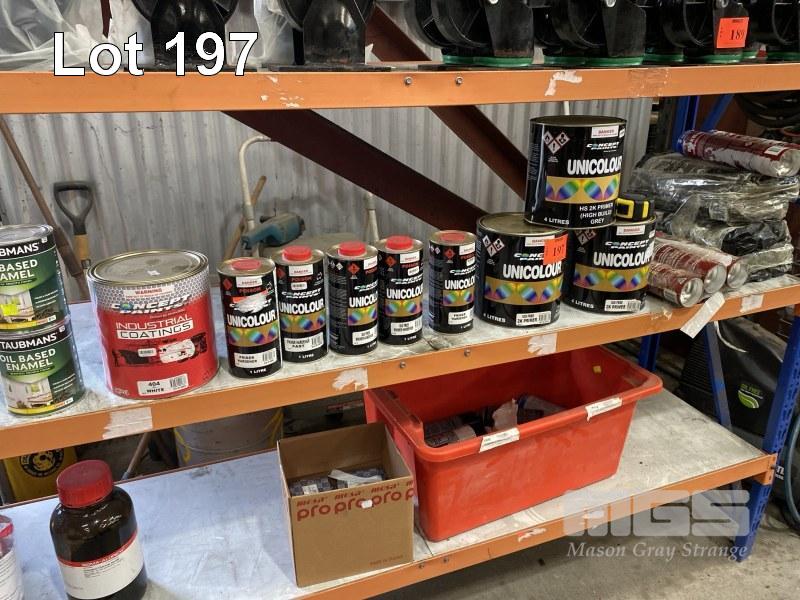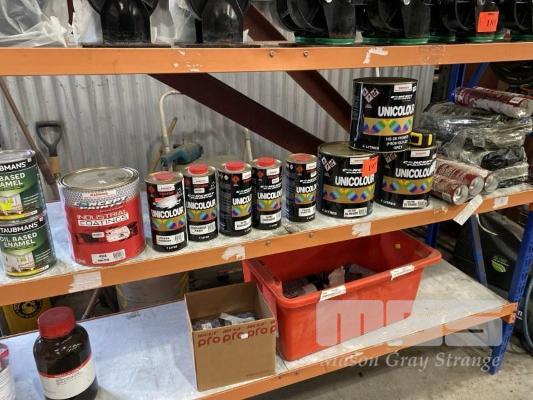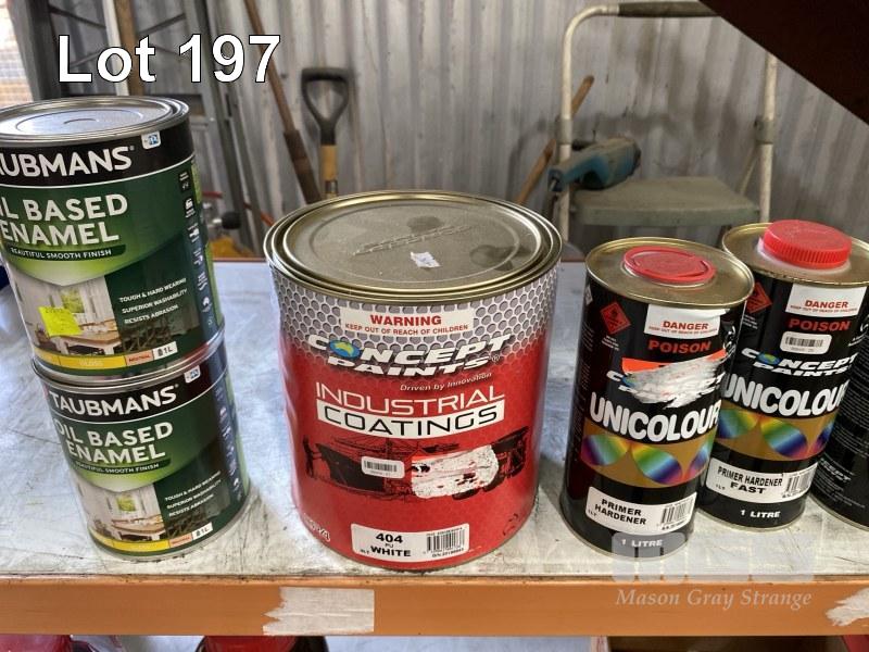 ASSORTED PAINT INCLUDING CONCEPT UNICOLOUR, 2K PRIMER, 3 x 4 LITRE TINS, PRIMER HARDENER, 5 x 1 LITRE TINS, TAUBMANS OIL BASED ENAMEL, 2 x 1 LITRE TINS, INDUSTRIAL COATING 404 WHITE, 4 LITRE TIN & 15 x TUBES CONSTRUCTION ADHESIVE, 900gm 1 x SHELF