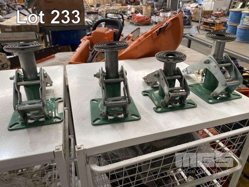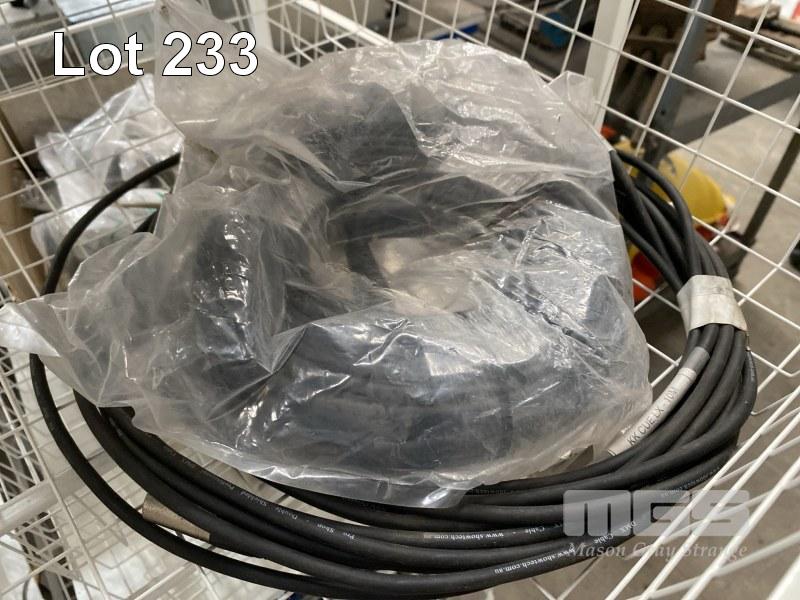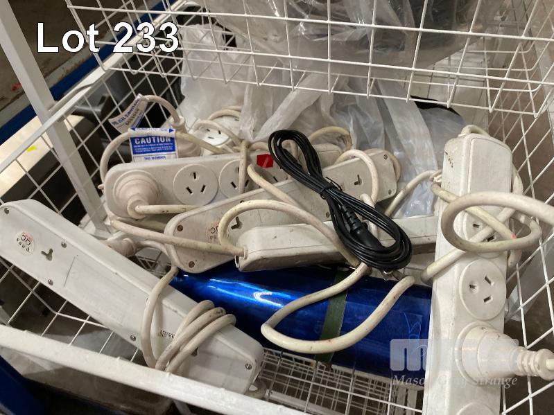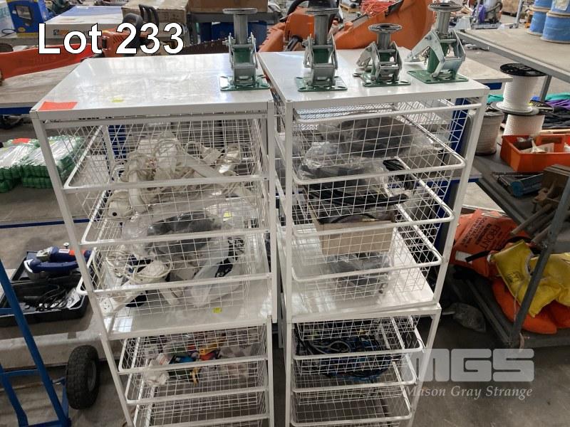 AUDIO VISUAL CABLES, POWER BOXES, 4 x ADJUSTABLE TROLLEY BRAKE/PROP STOPPERS, LIGHT GLOBES & 4 x WIRE MESH DRAWER UNITS, 4 DRAWER WITH FOLDING TABLE