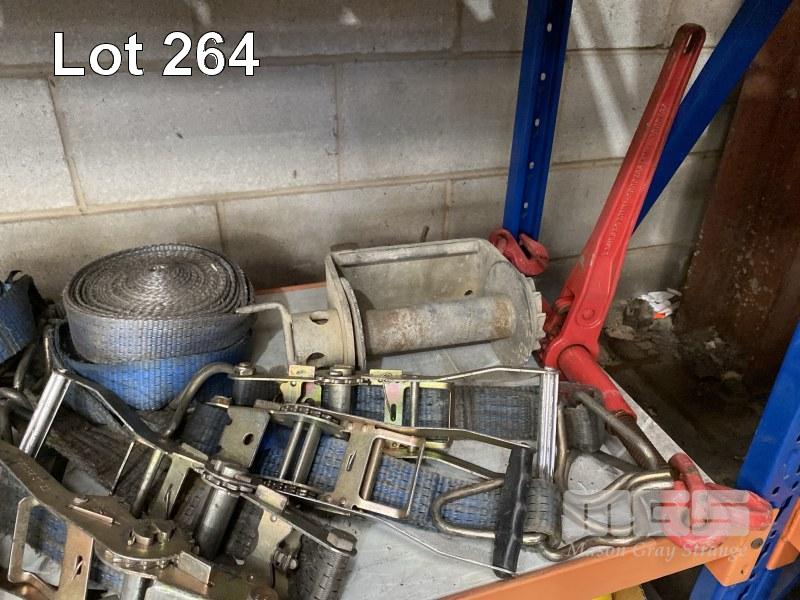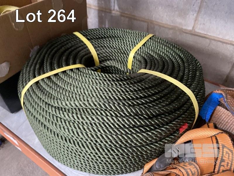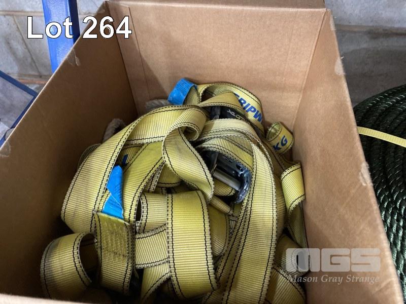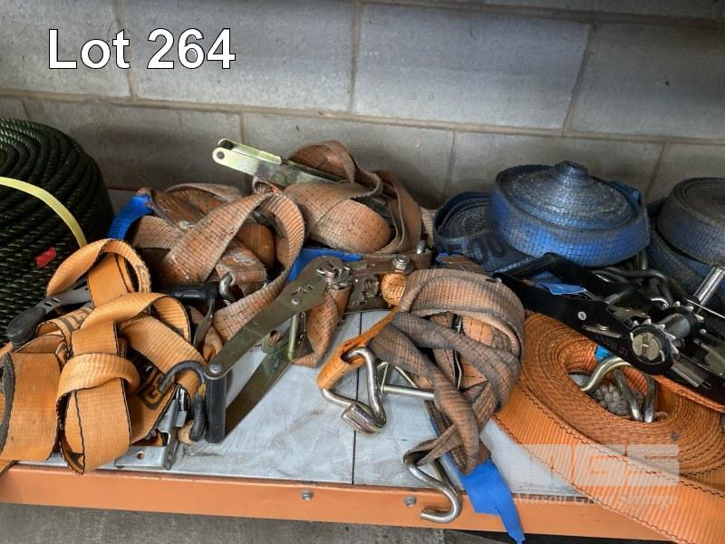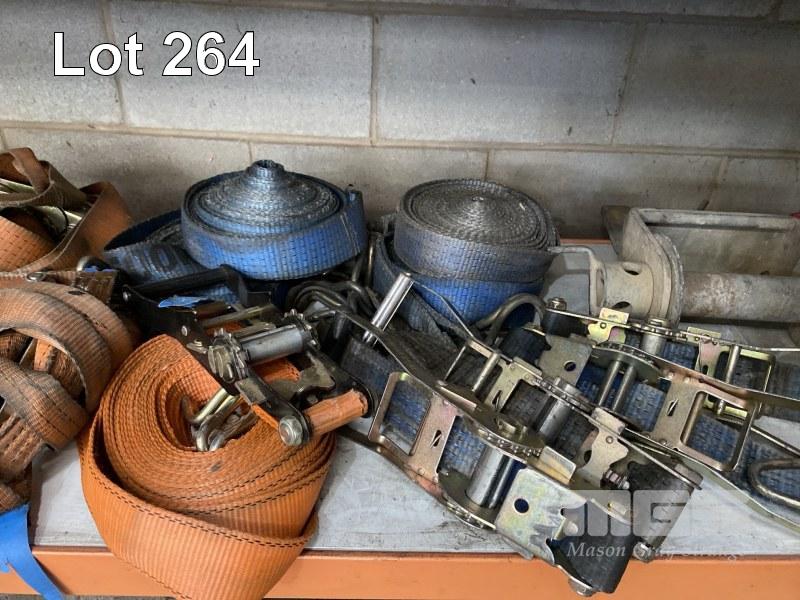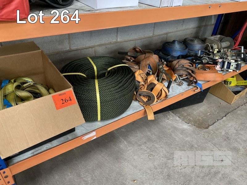 RATCHET STRAPS, HEAVY DUTY, 8 x SETS, CHAIN DOG, LOAD BINDER & COIL OF SYNTHETIC ROPE, GREEN, 10mm, APPROX 250m