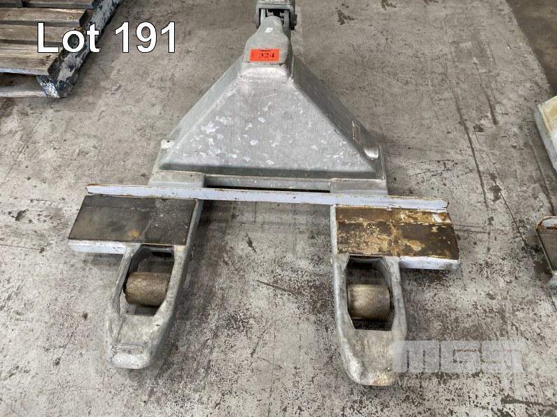 PALLET JACK, GALV STEEL, SHORT BLADES WITH BAR STOPS