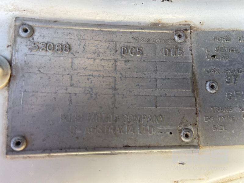 1996 FORD L8000 CEMENT TRUCK REG: NO REGO PLATES VIN: 6FPAAAAHG3SL52088 ODO: 65,854 kms SHOWING GCM: 24000kg CUMMINS, 6 CYLINDE TURBO DIESEL, 8 SPEED MANUAL TRANSMISSION, SPRING SUSPENSION, WHITE, TYRES 11R22.5, 2 DOORS, 2 SEAT, (NO PAPERS, WITH 1 KEY/S, NO OWNER'S MANUAL, NO SERVICE BOOKS) CONDITION: DEFECTED - BODY CORROSION *****SOLD INSITU BROOKLAND PARK****** -
