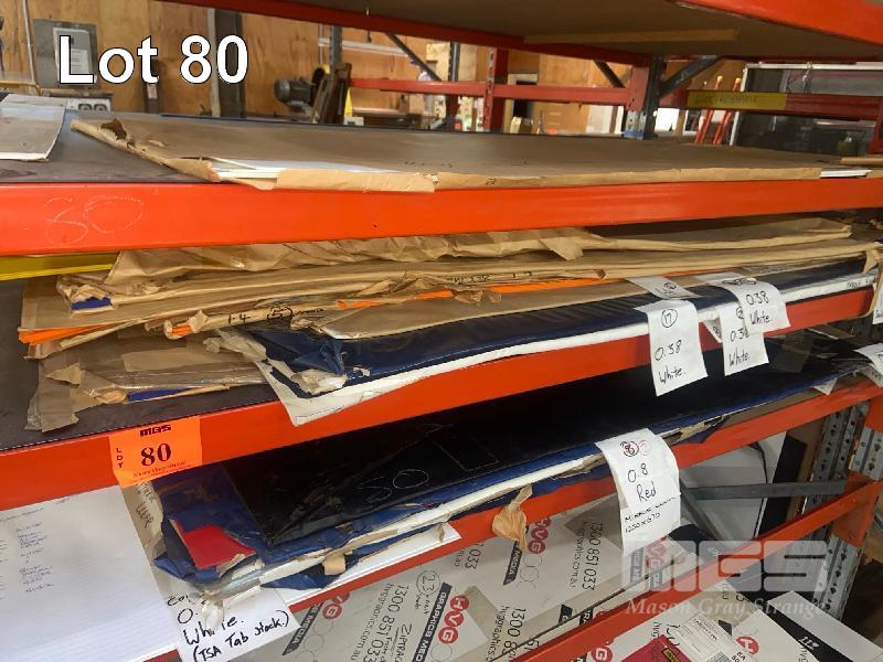 ASSORTED POLYPROPYLENE SHEETS INCLUDING 4 x SHEETS, 1.9mm, WHITE, 3 x SHEETS, 1.4mm, YELLOW, 5 x SHEETS, 1.4mm, BLUE, 14 x SHEETS, 1.4mm, ORANGE, 2 x SHEETS, 1.4mm, AQUA, 9 x SHEETS, 0.38mm, WHITE, 17 x SHEETS, 0.38mm, WHITE, 29 x SHEETS, 0.38mm, WHITE, 26 x SHEETS, 0.8mm, BLUE, 2 x SHEETS, 0.8mm, YELLOW, 17 x SHEETS, 0.8mm, CLEAR, 2 x SHEETS, 0.8mm, RED, 43 x SHEETS, 0.38mm, BLACK