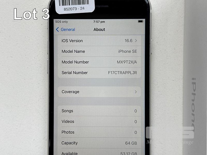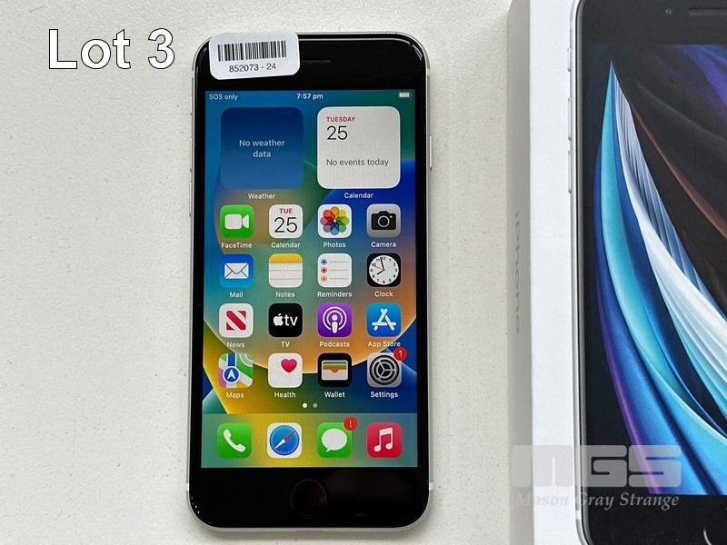 APPLE iPHONE SE, 64GB, WHITE, MODEL MX9T2X/A, A2296, BATTERY HEALTH 87% (NO CABLE, NO CHARGER) S/N:F17CTRAPPLJR