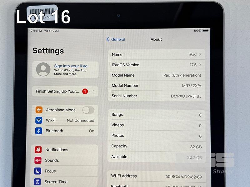 APPLE iPAD 6TH GEN, 32GB, Wi-Fi, SPACE GREY, MODEL MR7F2X/A, A1893 (NO CABLE, NO CHARGER) S/N:DMPXDJPRJF8J