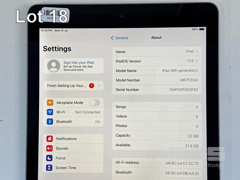 APPLE iPAD 6TH GEN, 32GB, Wi-Fi, SPACE GREY, MODEL MR7F2X/A, A1893 (NO CABLE, NO CHARGER) S/N:DMPXDFKDJF8J