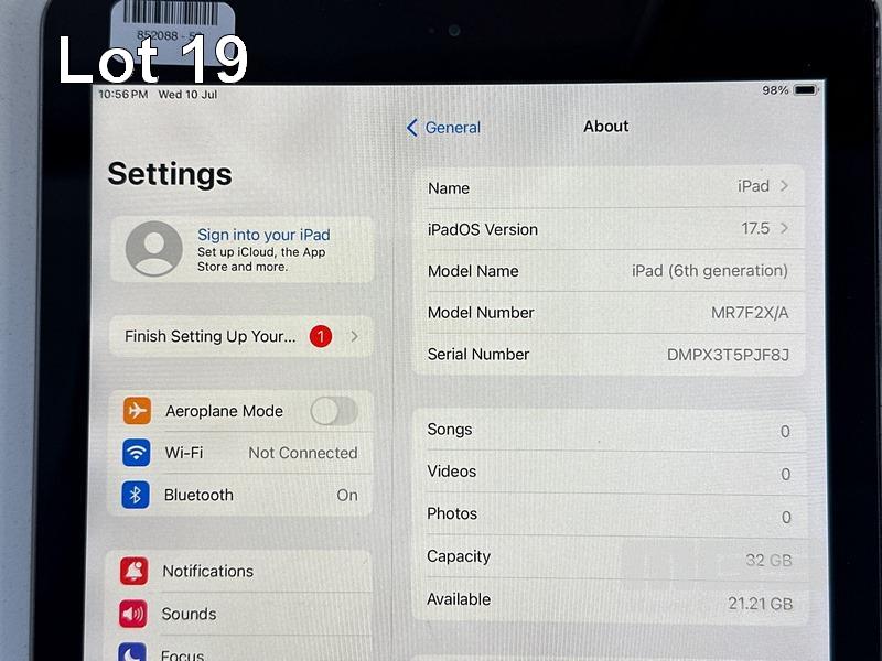 APPLE iPAD 6TH GEN, 32GB, Wi-Fi, SPACE GREY, MODEL MR7F2X/A, A1893 (NO CABLE, NO CHARGER) S/N:DMPX3T5PJF8J