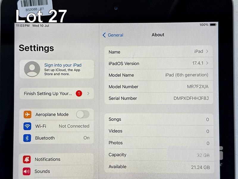 APPLE iPAD 6TH GEN, 32GB, Wi-Fi, SPACE GREY, MODEL MR7F2X/A, A1893 (NO CABLE, NO CHARGER) S/N:DMPXDFHHJF8J