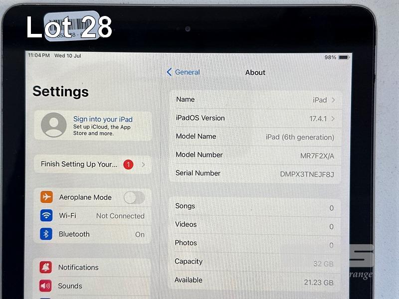 APPLE iPAD 6TH GEN, 32GB, Wi-Fi, SPACE GREY, MODEL MR7F2X/A, A1893 (NO CABLE, NO CHARGER) S/N:DMPX3TNEJF8J