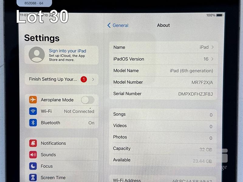 APPLE iPAD 6TH GEN, 32GB, Wi-Fi, SPACE GREY, MODEL MR7F2X/A, A1893 (NO CABLE, NO CHARGER) S/N:DMPXDFHZJF8J