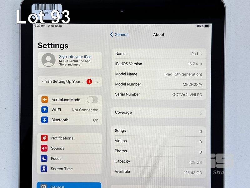 APPLE iPAD 5TH GEN, 128GB, Wi-Fi, SPACE GREY, MODEL MP2H2X/A, A1822 (NO CABLE, NO CHARGER) S/N:GCTV64LVHLFD